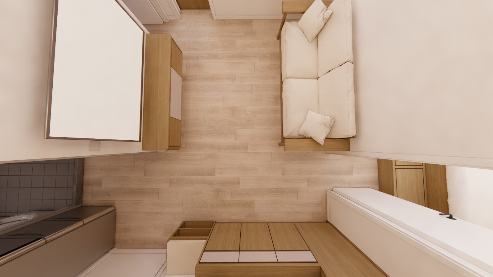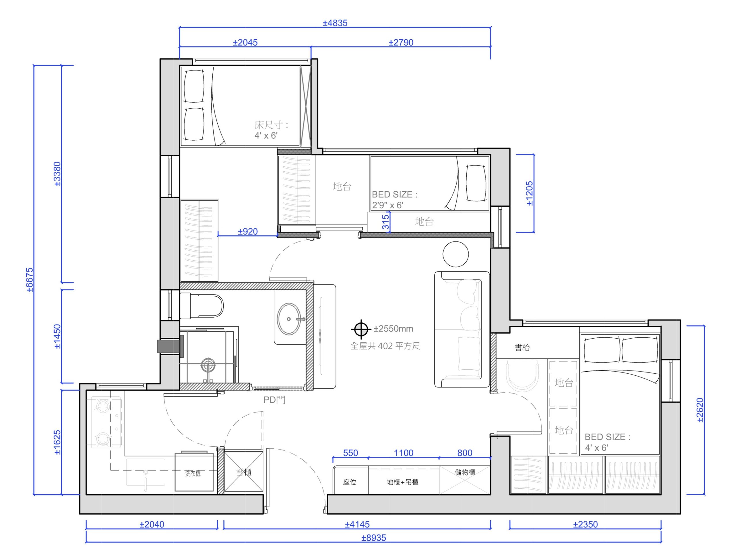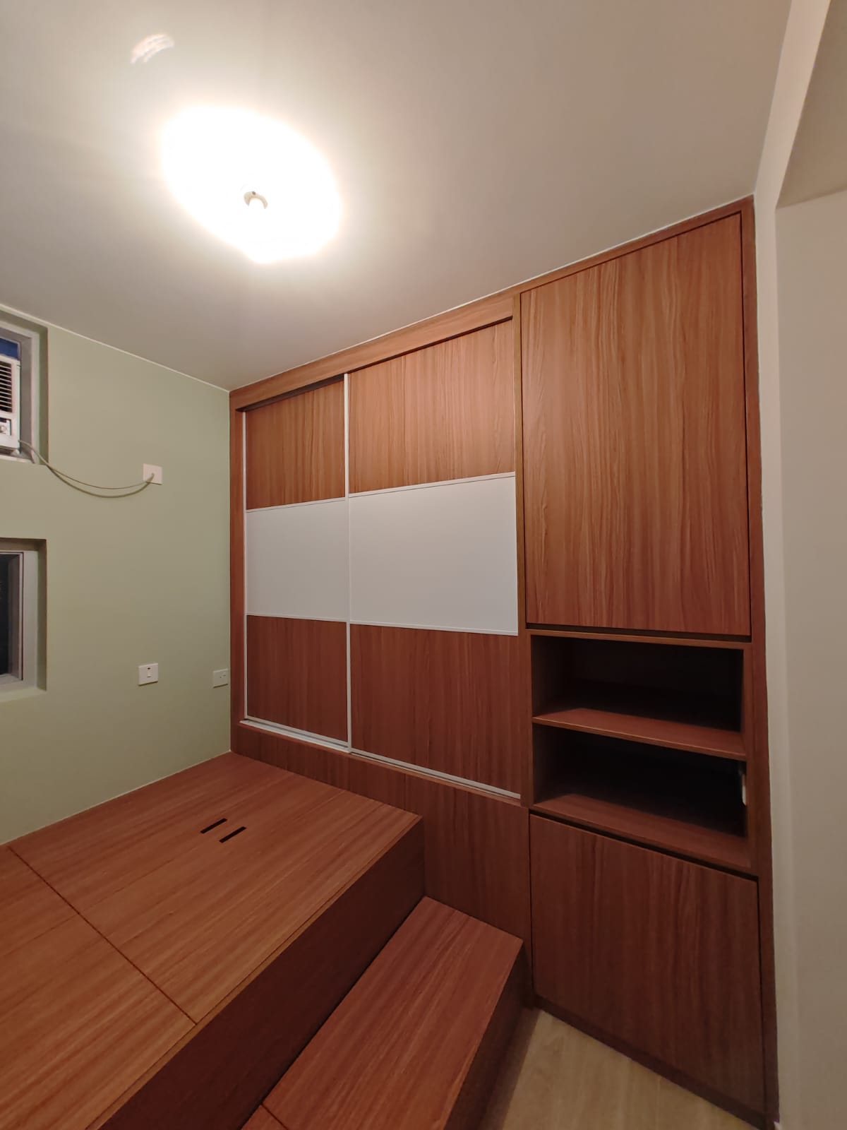 - 迎合多成員家庭的需求,利用地台而不用床架,以增加收納空間