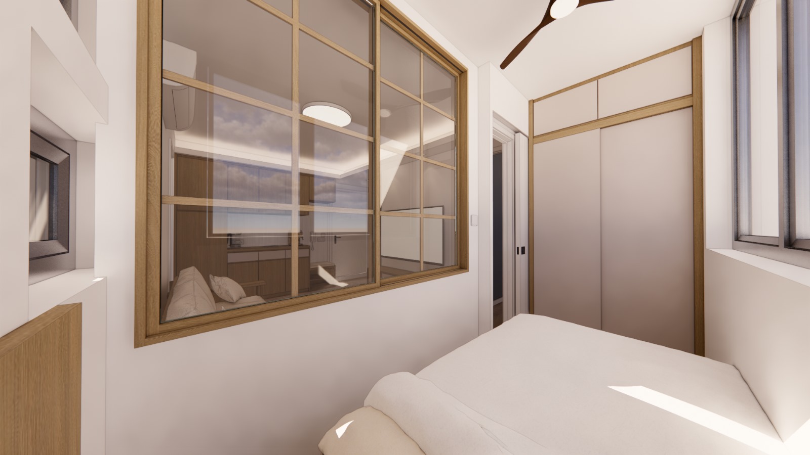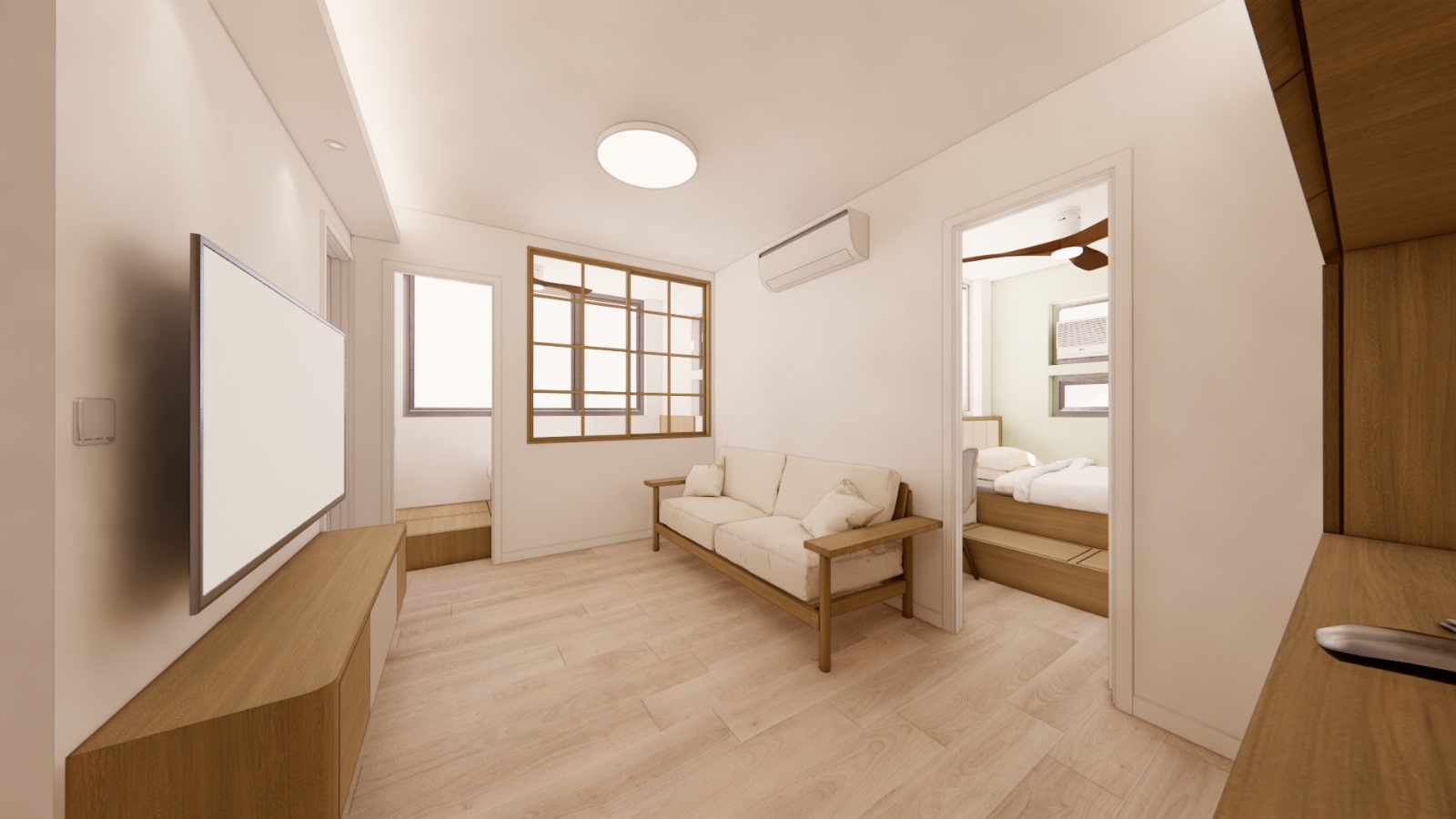 本裝修設計工程為全新樓盤打造,針對442平方呎的空間設計三房格局,包括一間主人房及兩間客房,迎合多成員家庭的需求。設計核心在於平衡儲物空間與實用性,採用內嵌式衣櫃及地台收納系統,確保充足儲物空間的同時保持空間流暢。由於單位對街窗門位置較少,採光受限,設計上融入大面積透明玻璃間隔,結合高效能室內照明系統,增強空間明亮度與通透感,營造舒適溫馨的居住環境。