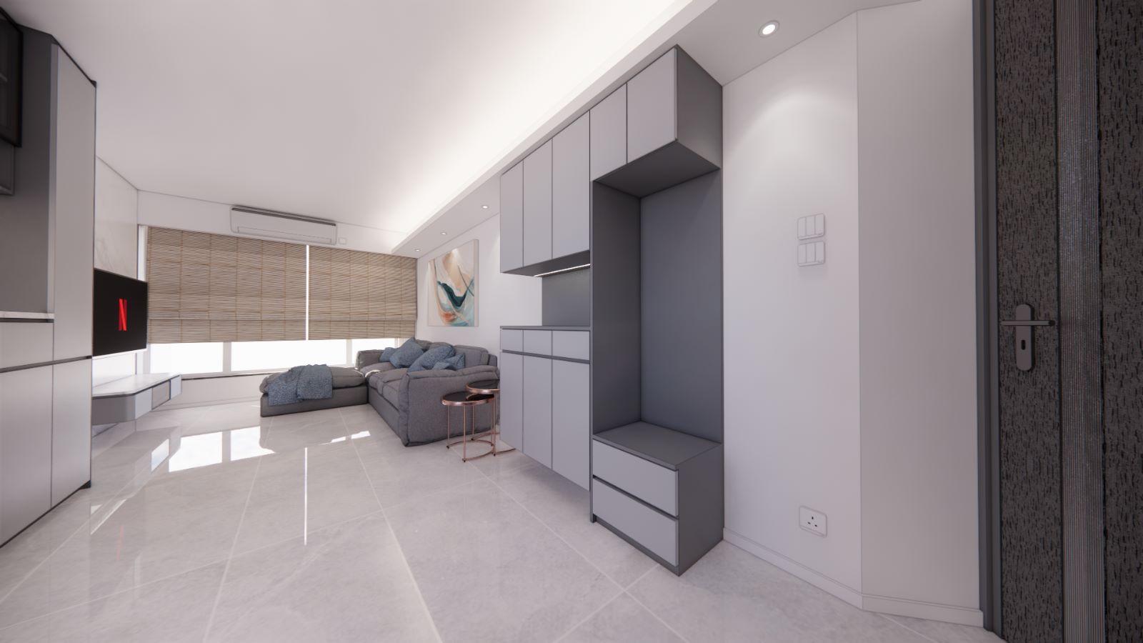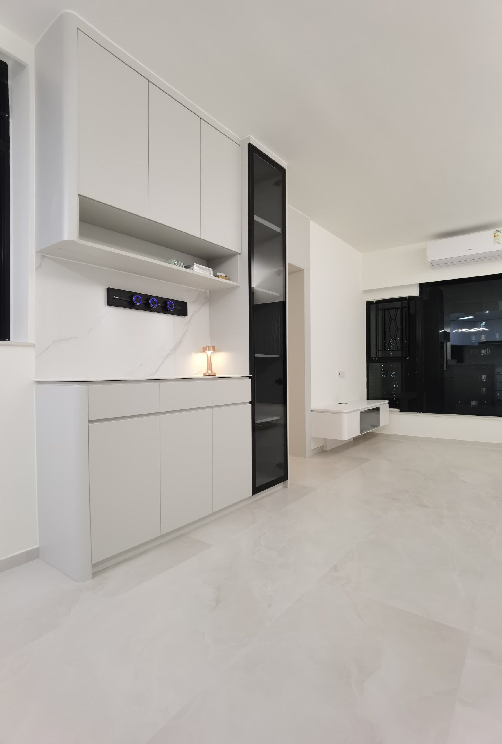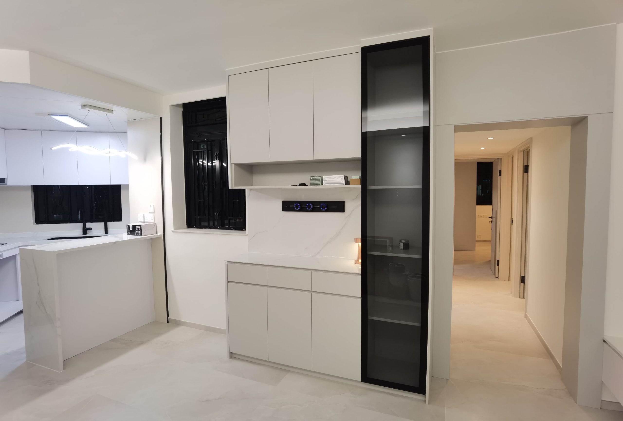 本裝修設計工程為全屋清拆從新裝修項目,針對636平方呎的空間打造三房格局,包括一間主人房及兩間客房,同時按屋主需求精心規劃出客廳、飯廳及開放式廚房。設計注重空間流動性與功能性,開放式廚房與飯廳無縫銜接,提升日常生活的便利與互動性。特別為屋主收藏的精品打造定制玻璃飾櫃,採用透明玻璃結合內置燈光設計,既突顯藏品的美感,又增添空間的現代感與通透感。整體布局充分利用空間,營造舒適、實用且具展示魅力的居住環境。