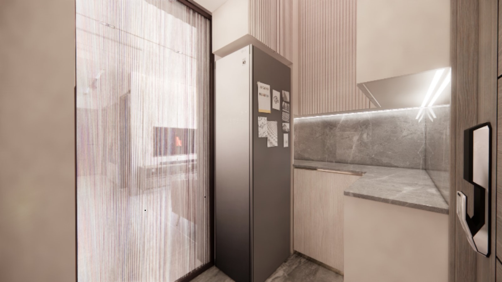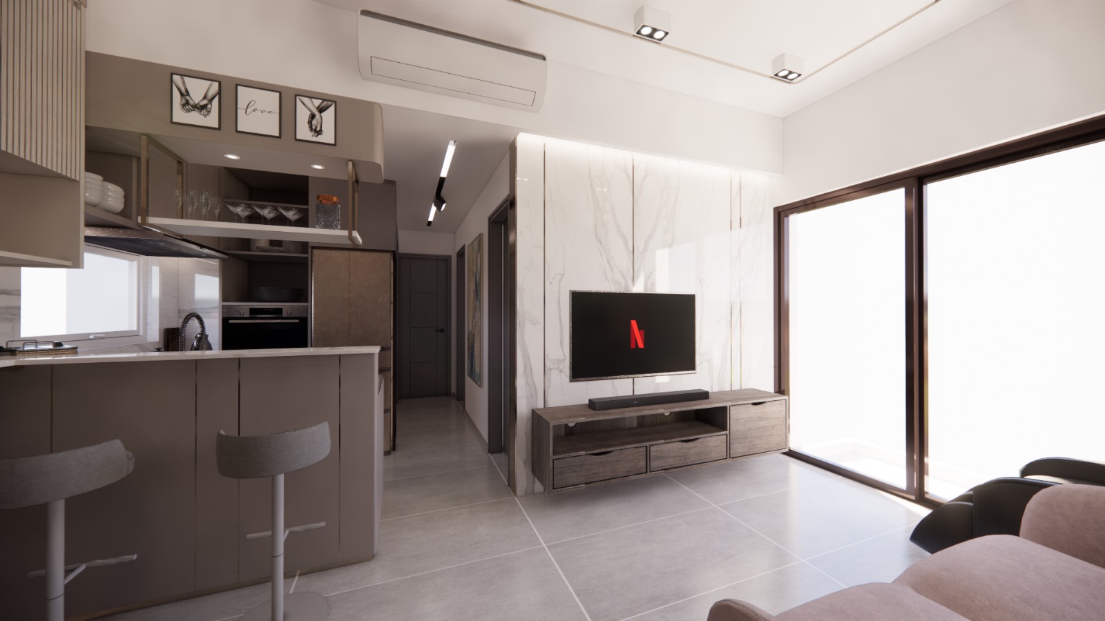 本裝修設計工程為全新清拆重建項目,針對568平方呎的空間打造兩房加一間儲物室的格局,結合客廳及開放式廚房,兼顧實用性與現代感。設計以條子元素為主軸,融入條紋圖案的牆面、傢俬及裝飾細節,營造視覺層次與動感。間隔採用磨砂玻璃門設計,增加空間通透感同時保留私密性,特別適合小面積單位提升空間感。開放式廚房與客廳無縫連接,配備實用島台,方便日常烹飪與社交互動。儲物室則提供充足收納空間,確保居室整潔,打造簡約而精緻的居住體驗。