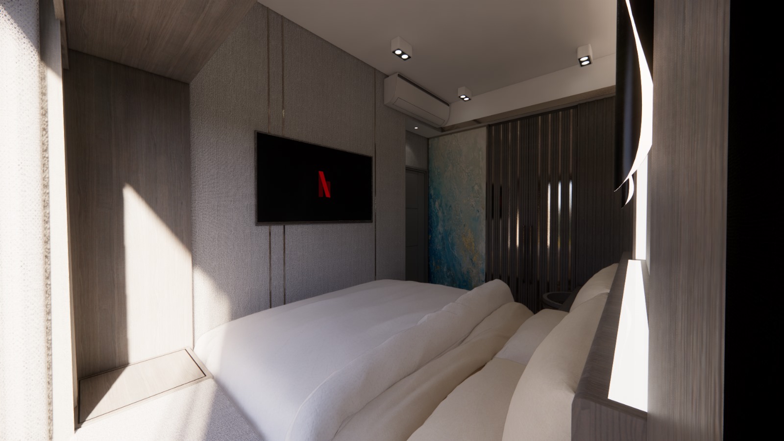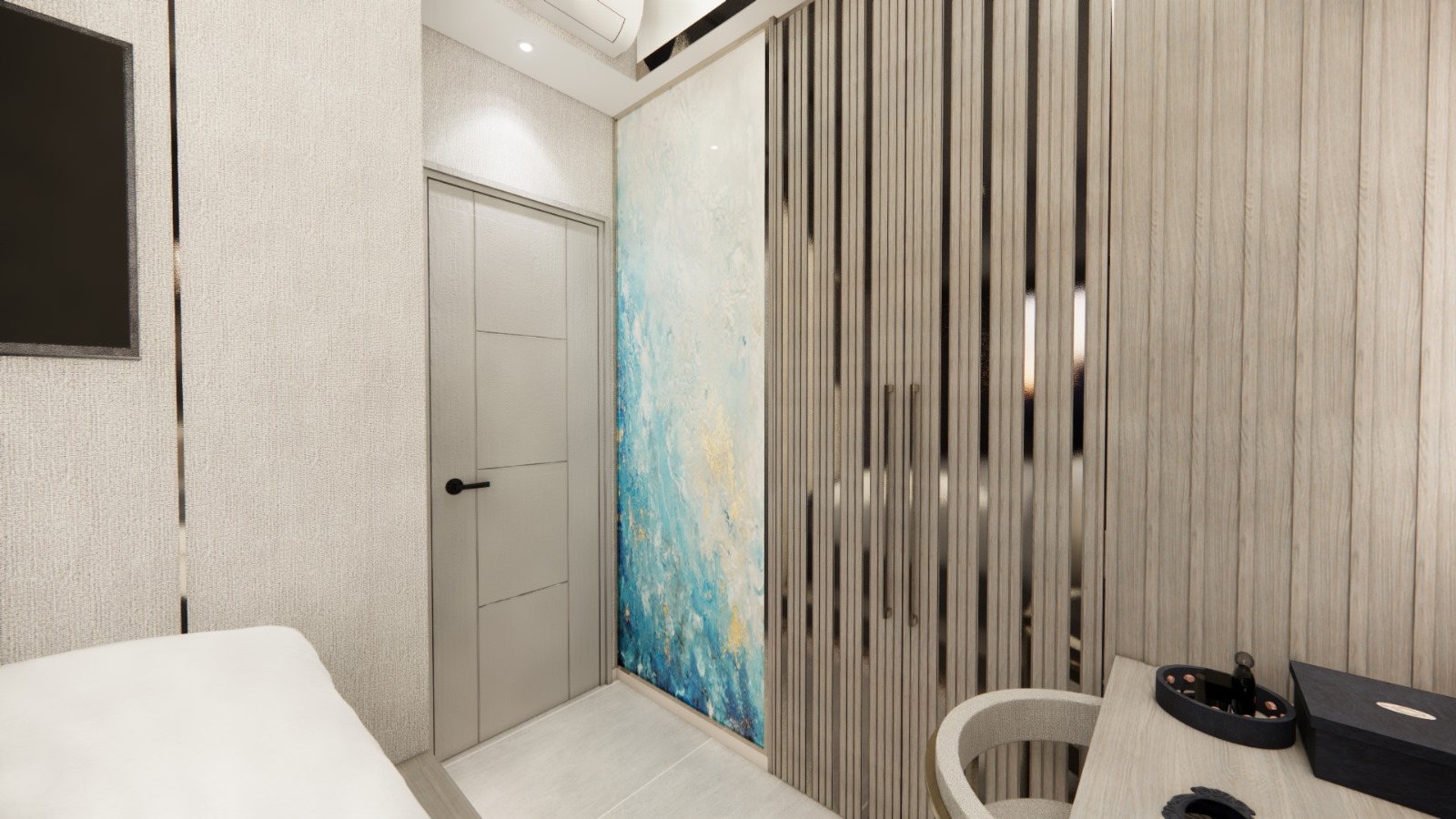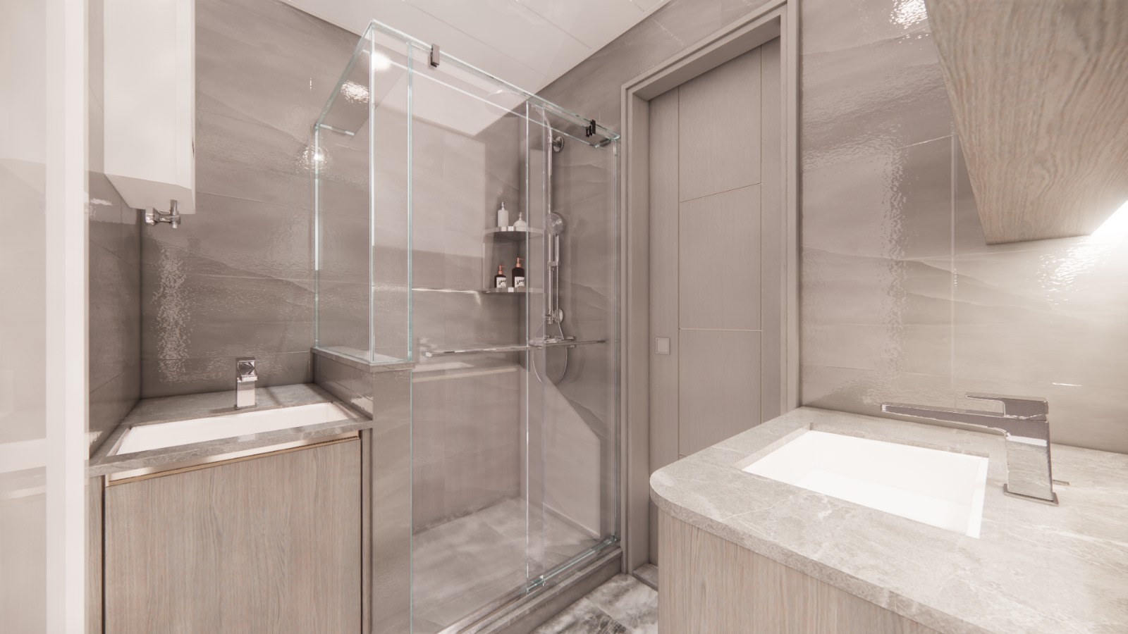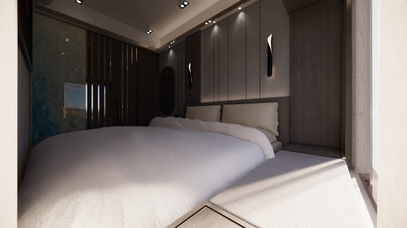 - 磨砂玻璃門間隔,增加空間通透感同時保留私密性